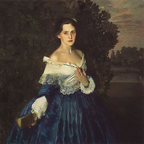 - (Из боковой двери входит Ольга, в белой кисейной юбке и чёрном кружевном канзу, с косой вокруг головы. <…>