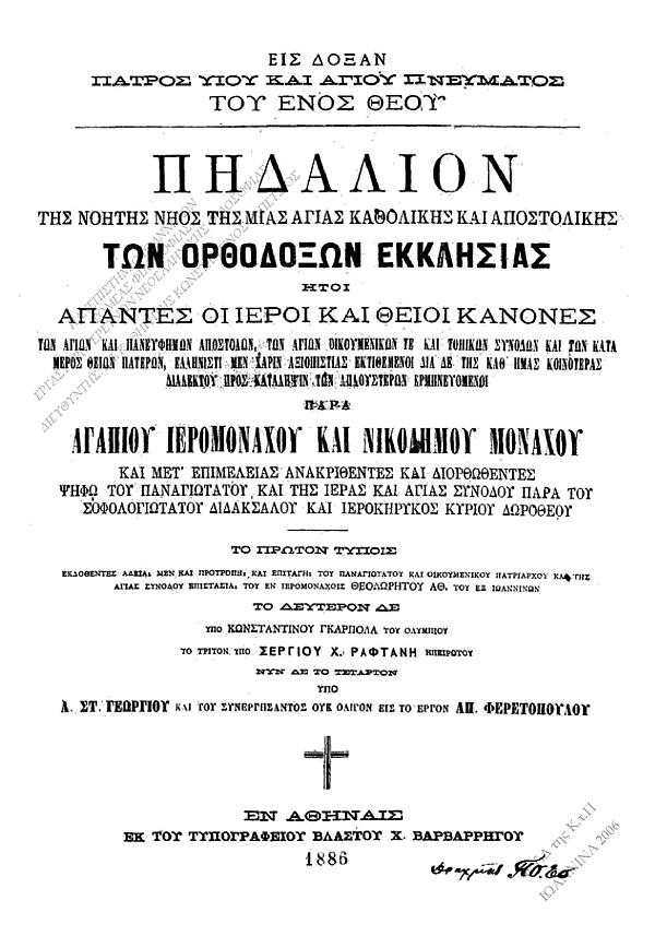 - Πηδάλιον • Αγαπίου Ιερομονάχου και Νικοδήμου Μοναχού — «Пидалион» (Сборник канонов Православной церкви с толкованиями прп. Никодима Святогорца на греческом) в Викимедии (Wikimedia)