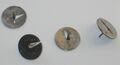| Набирает популярность гибридный вариант с гвоздиком от альтернативной и дискообразной шляпкой от классической кнопки. Шляпка выполнена из слегка выпуклого металла, иногда плакированного цветным напылением или покрытого разноцветным пластиком. Они не всегда долговечны, особенно если шляпка соединена с гвоздиком путём его обжима в центральный паз, а не точечной сваркой. |