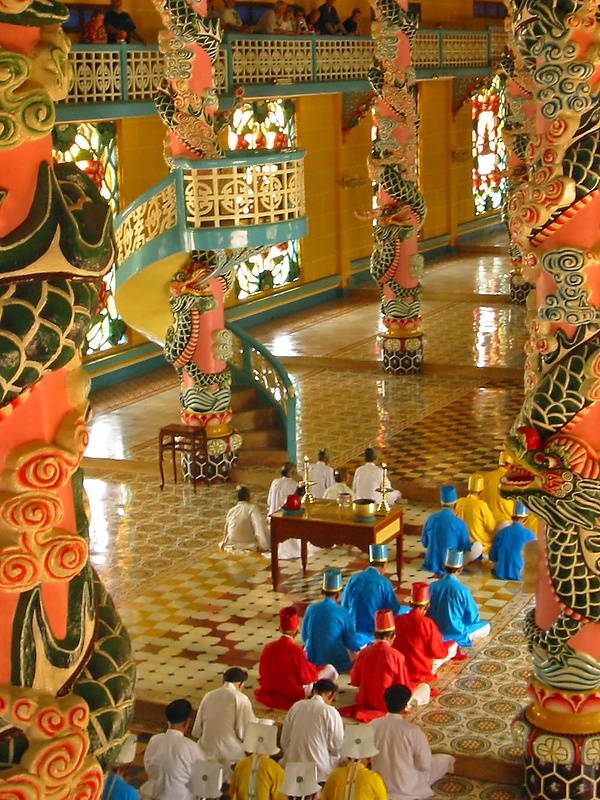 К началу ритуала всех иностранных гостей вежливо препроваживают на верхнюю галерею. Начинается тихая музыка, и люди в голубых, красных, жёлтых и белых халатах медленно входят в храм и занимают места. Спереди идут кардиналы, похожие на католических священников в сужающихся как ведро шляпах. Потом все занимают свои места — по рядам и по группам, в соответствии с разными религиями внутри Каодай.
