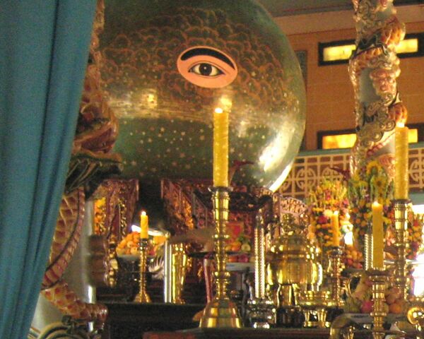 Символ Каодай — глаз в треугольнике, окружённый сиянием лучей («всевидящее око»)[29]. Это левый глаз Бога — считается, что именно он может глядеть в души. Красный, синий и жёлтый цвета используются на трёхцветном флаге Каодай и в богослужебных одеяниях в храмах. Они символизируют три религии: красный — католичество, жёлтый — буддизм, синий — даосизм. Белый цвет одеяний символизирует собственно Каодай.