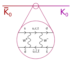 Поскольку нейтральные каоны имеют странность, они не могут быть своими собственными античастицами. Тогда должно быть два разных нейтральных каона, различающихся на две единицы странности. Вопрос в том, как установить существование этих двух мезонов. Решение использует явление, названное осцилляции нейтральных частиц, при котором эти два вида мезонов могут превращаться друг в друга посредством слабого взаимодействия, которое заставляет их распадаться на пионы (см. прилагаемый рисунок).