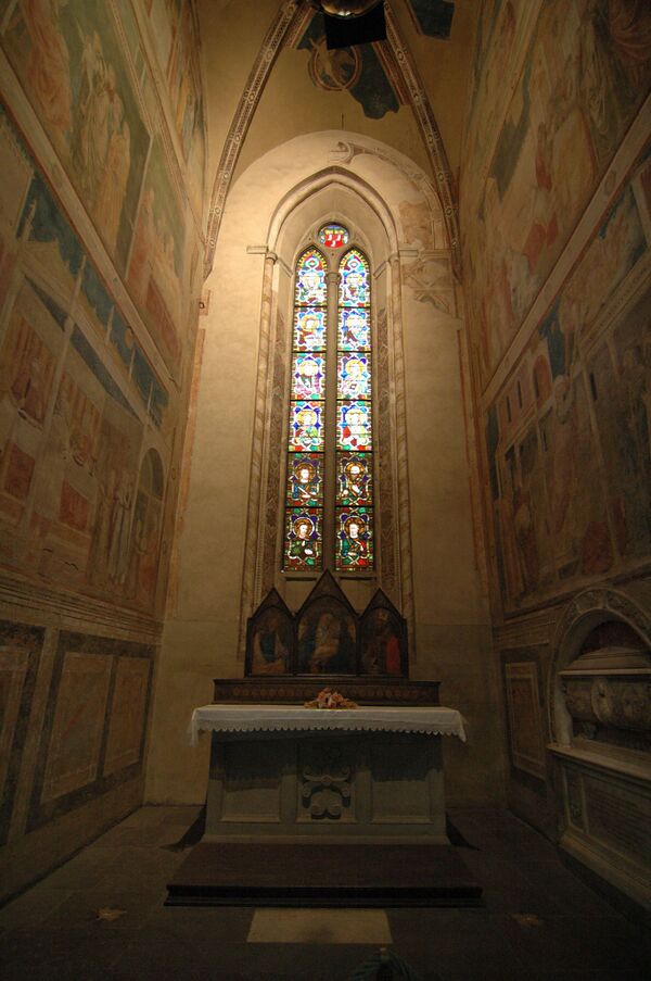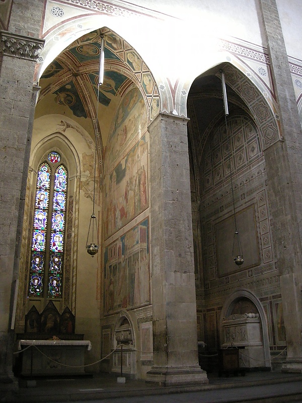 Церковь первоначально имела четыре капеллы со стенописью Джотто, но к XX веку сохранилось всего две: капелла Перуцци и Капелла Барди. В Капелле Перуцци представлены сцены из жизнеописаний Св. Иоанна Богослова и Иоанна Крестителя. Это шесть картин на боковых стенах и четыре узких фриза. Сцены жизни Иоанна Богослова (на правой стене, сверху вниз):