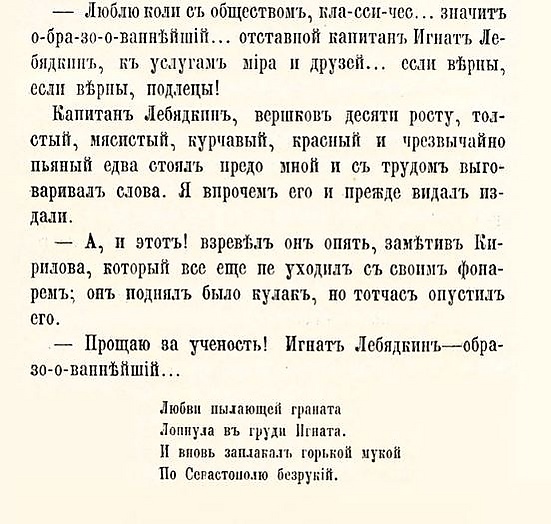 Пародийно-гротескный стиль, к которому пришёл Достоевский-поэт, нуждался в персонификации. Так возникает в черновиках одной ненаписанной повести галантный стихотворец капитан Картузов, а потом он вместе со всеми стихами переходит в «Бесы», где становится капитаном Лебядкиным.