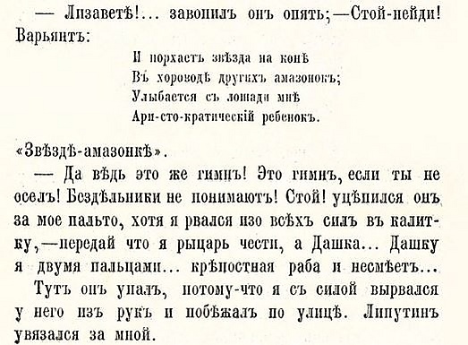 Другое стихотворение, в которой герой представляет Лизу травмированной, начинается строчками: «Краса красот сломала член / И интересней вдвое стала»[7]. В этих строчках, по мнению Сермана, заложена пародийная отсылка к целомудренной установке Белинского, который наотрез отказался включать в свою рецензию цитату из стихотворения поэта Владимира Бенедиктова: «Матильда спрыгнула; Седло остывает — и жаркие члены объемлет диван»[14]. Среди лебядкинских произведений, адресованных Тушиной, есть также почтительно-сентиментальное пожелание «брачных и законных наслаждений»; замыкается любовный цикл стихотворением про «звезду на коне», которое Игнат называет гимном[7].