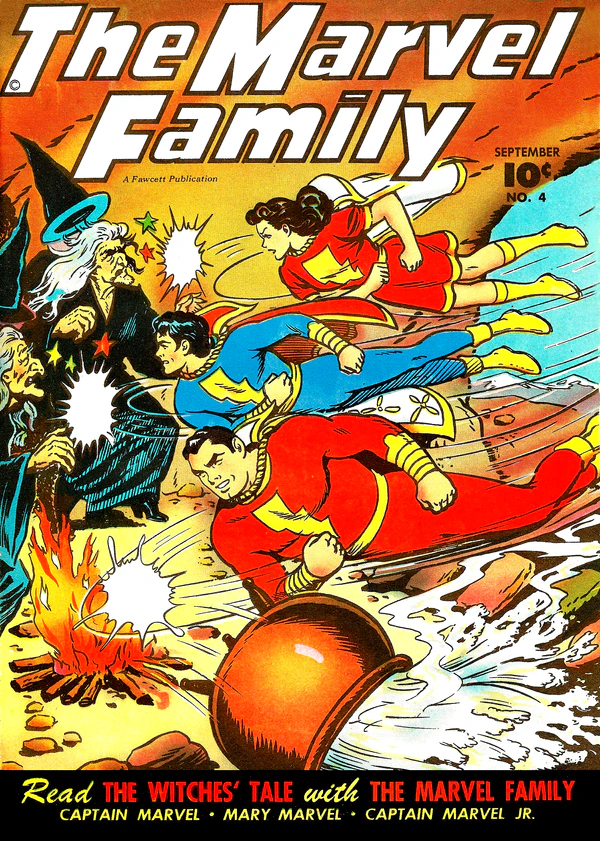 Fawcett Comics прекратила публикацию комиксов о персонаже в 1953 году — отчасти из-за спора о нарушении авторских прав на костюм героя с DC Comics. Издатель комиксов утверждал, что в Капитане Марвеле были незаконно использованы черты образа Супермена. В 1972 году DC лицензировала персонажей Семьи Марвел и вернула их в мир комиксов в своих публикациях, окончательно приобретя все права на персонажей в 1991 году. DC с тех пор внедрила Капитана Марвела и Семью Марвел в свою вселенную DC и пыталась несколько раз возродить популярность героя. Однако Капитан Марвел не приобрёл большой популярности у новых поколений, хотя в 1970-х о персонаже выходил насчитывающий три сезона телевизионный сериал Shazam! на CBS.