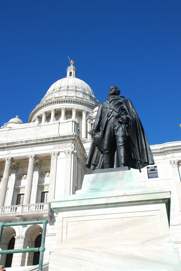 Южный вход Капитолия обращён к даунтауну города Провиденс и заливу Наррагансетт. Ко входу ведёт широкая парадная лестница, сделанная из мрамора. По разным сторонам от лестницы находятся бронзовые статуи уроженцев Род-Айленда коммодора Оливера Хазарда Перри и генерала Натаниэля Грина[8][6].