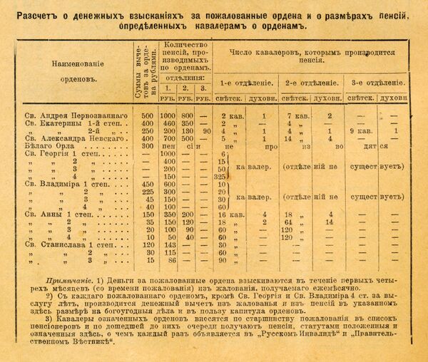 Капитул распоряжался значительными денежными суммами, которые складывались из казённых ассигнований и взысканий с награждённых. Взыскания удерживались со всех награждённых, за исключением кавалеров ордена Св. Георгия и ордена Св. Владимира 4-й степени за выслугу лет. При получении с 1860 года ордена Андрея Первозванного взыскание составляло 500 руб.; Св. Владимира 1-й степени — 450; Св. Александра Невского — 400; Белого Орла — 300; Св. Анны 1-й степени — 150; Св. Станислава 1-й степени — 120 руб. Часть взысканий направлялась на благотворительные цели. Средства Капитула шли также на пенсии ограниченному статутом количеству кавалеров по каждому ордену и каждой степени согласно очерёдности награждения. Орденские пенсии, в силу их относительно малого количества, получала незначительная часть награждённых. Так, для кавалеров низших степеней орденов Св. Владимира, Св. Анны и Св. Станислава срок ожидания пенсии составлял 40—50 лет[6].