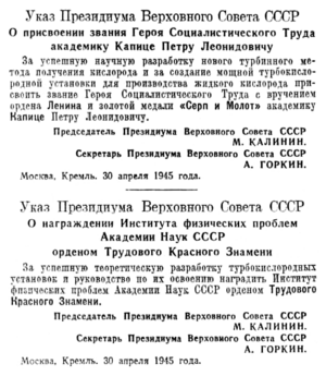 По его предложению 8 мая 1943 года постановлением Государственного комитета обороны создаётся Главное управление по кислороду при СНК СССР, начальником Главкислорода назначается Пётр Капица. В 1945 году организован специальный институт кислородного машиностроения — ВНИИКИМАШ и начал выходить новый журнал «Кислород»[28]. В 1945 году получил звание Героя Социалистического Труда, а возглавляемый им институт был награждён Орденом Трудового Красного Знамени[29].