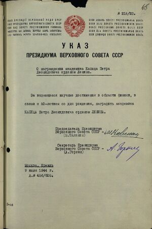 Пётр Леони́дович Капи́ца (26 июня [8 июля] 1894, Кронштадт, Санкт-Петербургская губерния, Российская империя — 8 апреля 1984, Москва, РСФСР, СССР) — советский физик, инженер и инноватор. Лауреат Нобелевской премии (1978). Дважды Герой Социалистического Труда (1945, 1974). Лауреат двух Сталинских премий l степени (1941[a], 1943). Награждён Большой золотой медалью имени М. В. Ломоносова АН СССР (1959). Член Академии наук СССР (1939; член-корреспондент с 1929)[4]. Член Лондонского королевского общества (1929)[5], иностранный член Национальной академии наук США (1946)[6], член Леопольдины (1958). Кавалер шести орденов Ленина.
