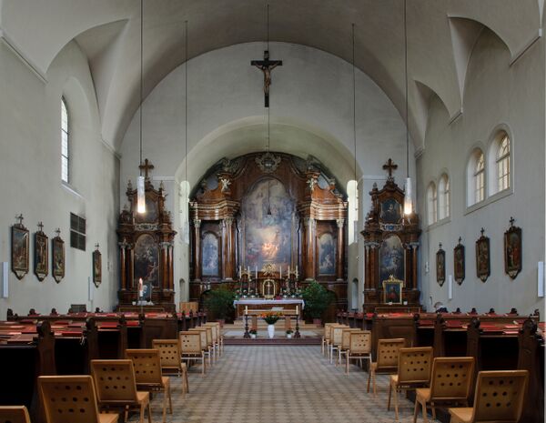 Основана в 1617 году императрицей Анной, женой императора Матвея, первый камень заложен в 1622 году, освящена в 1632 году. Портал пристроен в 1760 году, реконструирован по историческим изображениям в 1934—1936 и украшен фреской Ганса Фишера. Мраморный алтарь работы Петера Штруделя (1660—1714), ширина нефа 10 м.