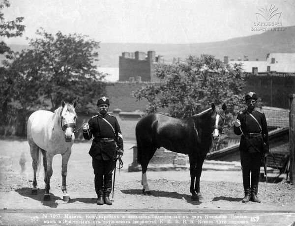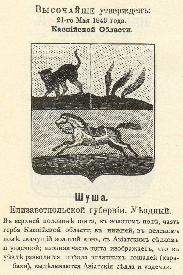 Карабахскими конями пользовались и находившиеся на военной службе на Кавказе русские чиновники и генералы. Русский поэт Александр Пушкин, совершивший в 1829 году путешествие в Арзурум, в своих путевых заметках писал, что «молодые русские чиновники разъезжали верхами на карабахских жеребцах»[9]. По сведениям военного историка генерала В. А. Потто, карабахский конь был и у генерала Я. И. Чавчавадзе[10]. 21 мая 1843 года был утверждён гласный герб города Шуша Елизаветпольской губернии, на котором была изображена лошадь карабахской породы. Особого упоминания карабахская порода лошадей удостоилась в статье «Елизаветпольская губерния» ЭСБЕ.