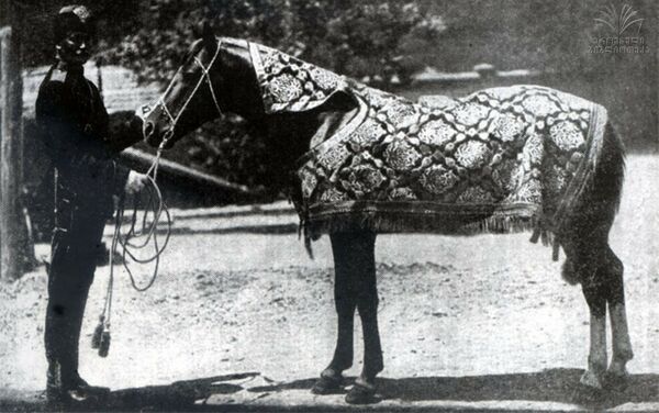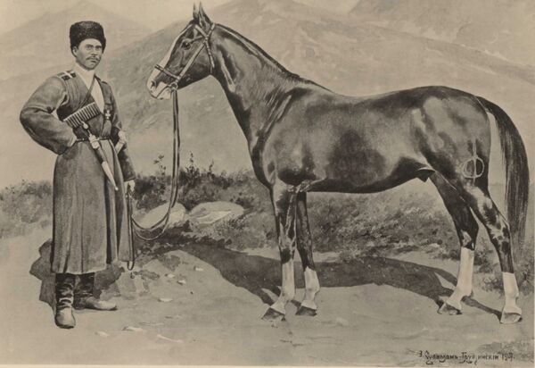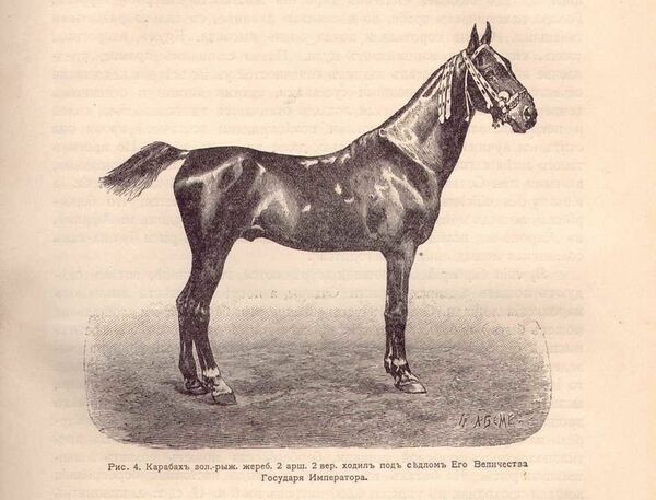 При сем должно заметить, что Карабагские лошади во всём Закавказском крае славятся красивостию своею и легкостию бега, и по справедливости пользуются сею славою, а чистота в сложении, жар, лёгкость и послушность поставляют их наряду с лучшими породами, особенно удобными для верховой езды; они ценятся на месте от 30 до 500 червонцев, смотря по разности качеств и сложения; порода Карабагских лошадей происходит от смеси с Арабскими, которых Ханы Карабага доставляли от арабов, для улучшения своих заводовСтатистическое описание Закавказского края[8]