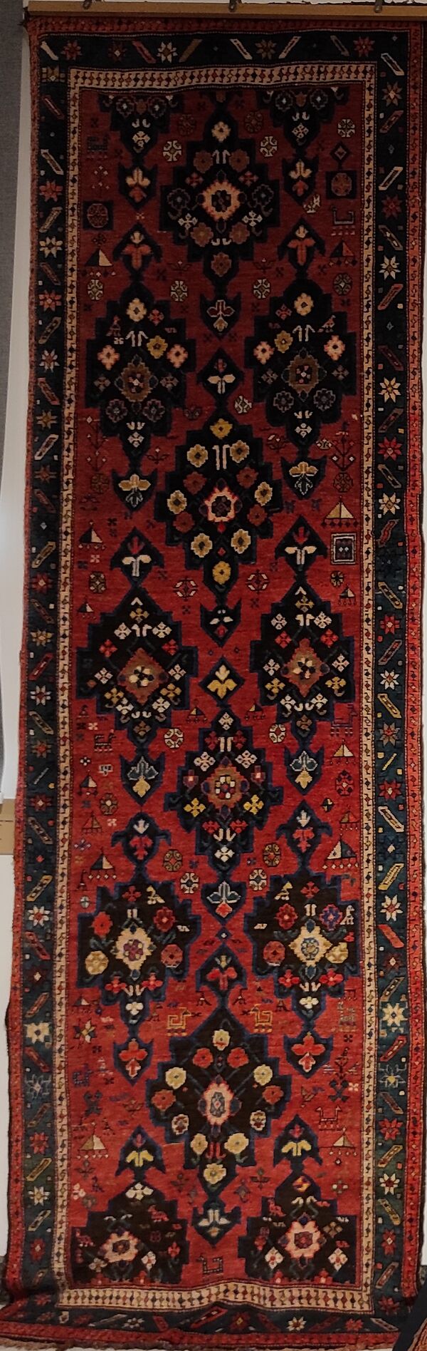 Карабахские ковры различной композиции имеют множество отличий. Бордюрный пояс, который опоясывает среднее поле ковра, состоит из 3—4 полос. Рисунок широкой каймы ковра заполнен растительным орнаментом, в то время как рисунок узкой каймы состоит из узоров, применяемых в архитектурных украшениях. Фон таких ковров ткали в тёмно-синем и в красном цвете. В орнаментальных украшениях фона и бордюрного пояса ковра использовались красный, золотисто-желтый, коричневый, кремовый, зеленый, белый, а иногда и черный цвета[15].