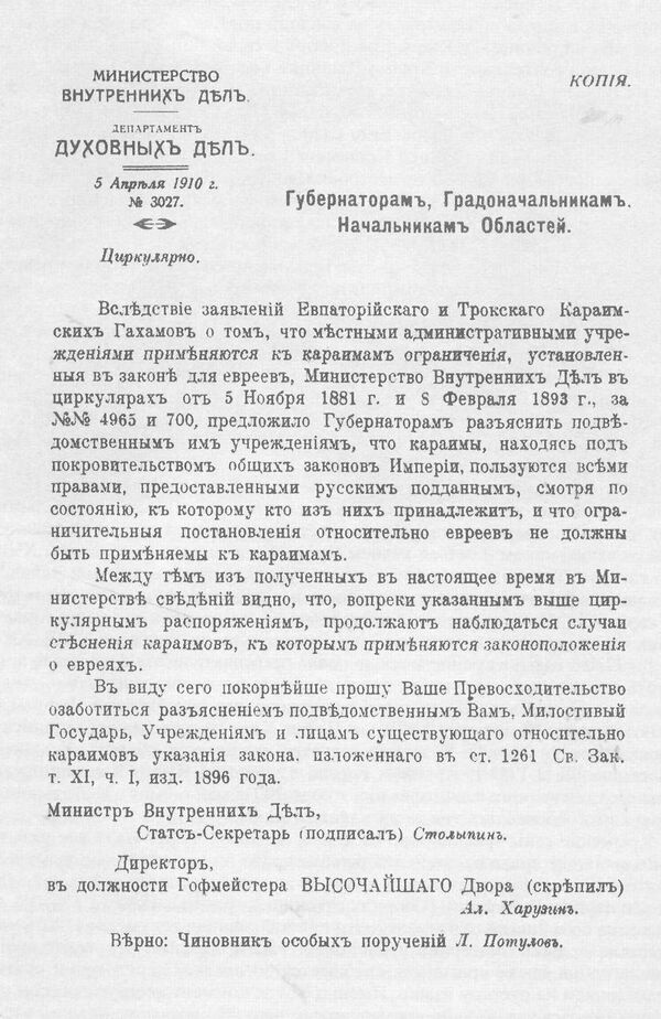 Караимы, являясь коренными обитателями Крыма, представляют собою объединенную общностью веры, крови, языка и обычаев особую народность, издревле сохраняющую неразрывную духовную связь со своими Константинопольскими, Иерусалимскими и Египетскими единоверцами.