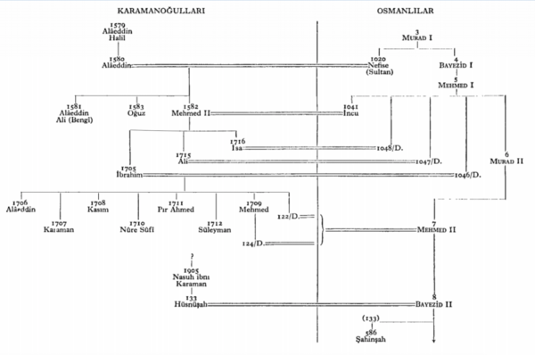 Увеличение влияния Караманидов совпало с браком Караманоглу Алаэддина-бея с Нефисе-султан, дочерью османского султана Мурада I, первым династическим союзом с османами[12][20].