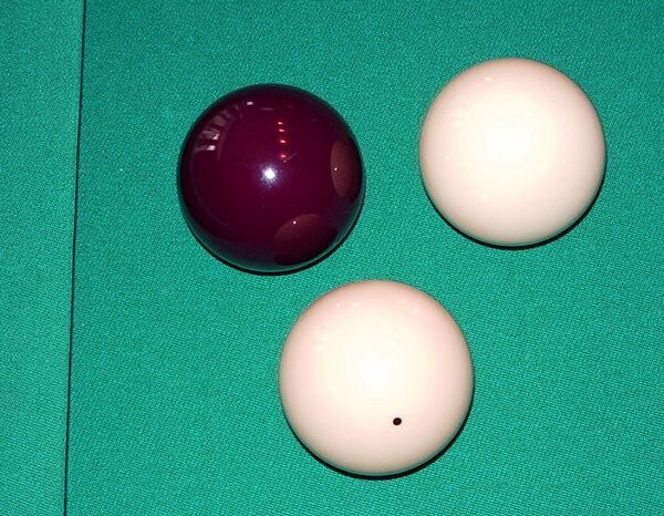 - Выставить соприкасающиеся шары: красный на заднюю отметку, свой биток — на переднюю отметку и биток соперника — на центральную отметку. Если соответствующая точка занята, то шар выставляется на отметку, предназначенную для мешающего прицельного шара.
