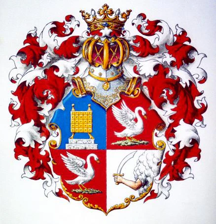Четвертованный щит, в первой гласной четверти которого в голубом поле изображён золотой щит, поставленный на камне. Во второй и третьей четвертях герба, в красном полях, помещён серебряный лебедь с распростёртыми крыльями (польский герб Лебедь). В четвёртой — выходящая из облака рука, держащая поднятую вверх саблю (польский герб Малая Погоня).
