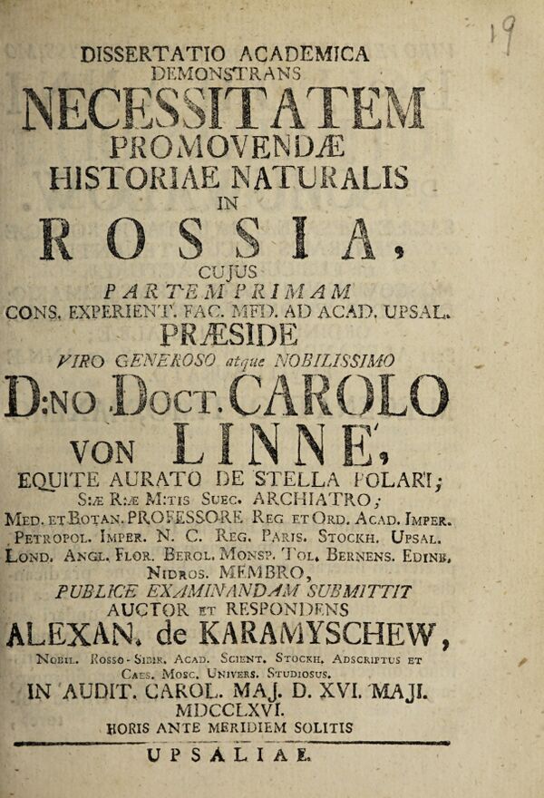 - В диссертации приводится краткая характеристика территории Российской империи, в том числе её климатические особенности, даётся краткий обзор всей естественнонаучной деятельности в стране, делается вывод о необходимости дальнейшего исследования территории страны в хозяйственных и лечебных целях. В частности, сообщается о том, что Петром Первым была учреждена Академия наук и создан естественнонаучный музей — Кунсткамера; последовательно приводятся сведения о научной деятельности известных путешественников-исследователей, работавших в России, — Даниэля Мессершмидта, Иоганна Буксбаума, Иоганна Гмелина (старшего), Степана Крашенинникова, Георга Стеллера, Иоганна Аммана, Иоганна Гейнцельмана, Трауготта Гербера, Ивана Лерхе, Готлиба Шобера и Давида де Гортера; говорится о ботанических публикациях в «Комментариях» Петербургской Академии, о растениях, которые были из России занесены в Западную Европу, а также о растениях из Сибири, которые выращивались в Уппсале в университетском ботаническом саду; приводятся некоторые зоологические сведения, в том числе перечисляются животные, описанные на основе материалов Кунсткамеры[15].