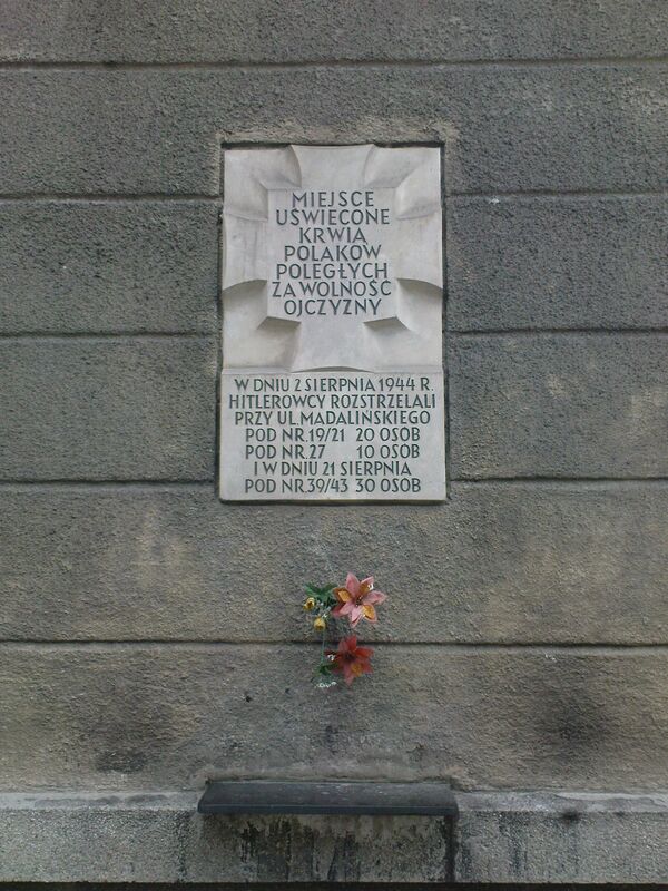 В первые дни августа немецкие отряды на Мокотуве — подразделения СС, полиции и вермахта — несколько раз совершали карательные вылазки против польского гражданского населения. Акции сопровождали, как правило, выборочные казни и поджоги домов. Уже 2 августа солдаты СС из казармы на ул. Раковецкой прибыли на улицу Мадалиньского, где приступили к убийствам мирного населения. Расстреляли тогда, по крайней мере, несколько десятков жителей домов № 18, 20, 19/21, 22, 23 и 25 (в основном мужчин)[24][25]. Погибли также шесть жителей дома на ул. Казимирской, 76 (в том числе три женщины и ребёнок)[25][26]. В доме на ул. Мадалиньского, 27, немцы заперли десятерых мужчин в маленькой столярной мастерской и затем сожгли их заживо[24][25].