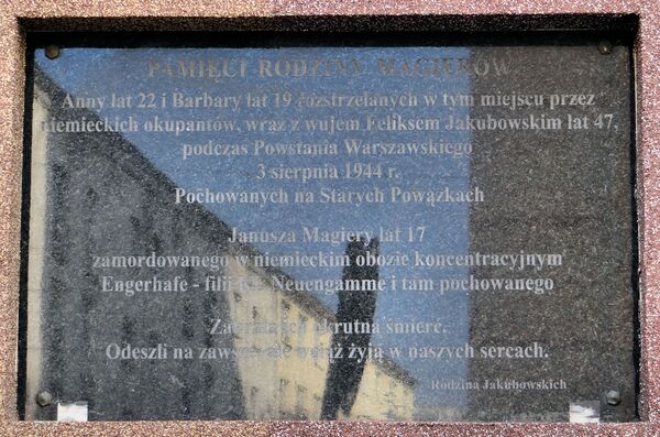 4 августа акции усмирения были также осуществлены в окрестностях ул. Раковецкой. Солдаты СС (из казармы на Раковецкой) и люфтваффе (из казарм на Пулавской) заходили в дома, бросая гранаты и стреляя в людей, открывающих им двери. Тогда убили около 30 жителей домов № 5, 9 и 15 по Раковецкой и, по крайней мере, 20 жителей домов 19/21 и 23 по Сандомирской[40]. Двух раненых женщин солдаты люфтваффе оставили в подожжённом подвале, где они сгорели заживо[41].