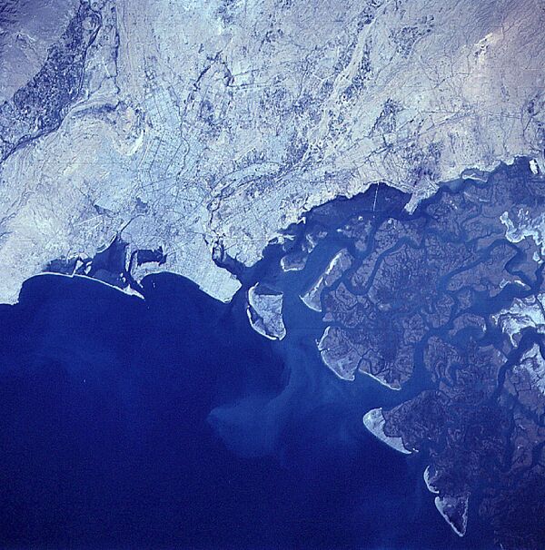 Обширная Индо-Гангская равнина упирается в массив Деканского плоскогорья, образуя прогиб, переходящий в складчатые горы и сформировавшийся под воздействием седиментации. Карачи находится в засушливой зоне возле Инда, на окраине равнины. Единственными источниками воды здесь, на западной оконечности равнины, являются короткие реки, прерывающиеся ирригационными оазисами, и сам Инд, протекающий в 40 км от города по широкой речной долине.