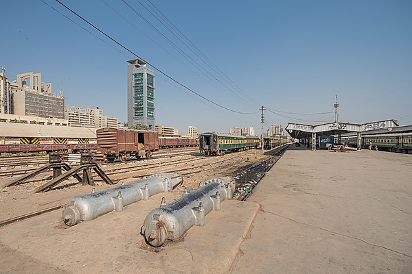 В городе есть два крупных железнодорожных вокзала. Карачи связан железнодорожным сообщением с другими городами Пакистана. По железным дорогам перевозится большое количество грузов из порта Карачи, также многие люди предпочитают добираться на поезде до других городов страны.
