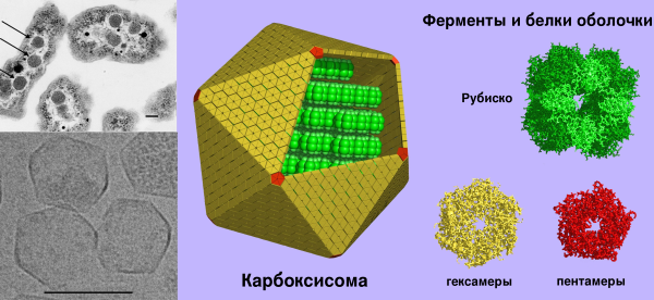 Многие вирусные капсиды также состоят из шестиугольных и пятиугольных белков. Исследования методом электронной криотомографии подтвердили приблизительно двадцатигранную геометрию карбоксисомы и визуализировали молекулы ферментов внутри, расположенные в нескольких концентрических слоях[16][17]. Кроме того, недвадцатигранные формы некоторых карбоксисом можно объяснить в пределах вариации теории гетерогенных тонких мембран[18]. Поскольку карбоксисомы структурно весьма схожи с вирусами по внешнему виду и строению, а также из-за поступавших на ранних этапах сообщениях о выделении из них ДНК, у многих учёных возник соблазн связать происхождение карбоксисом с бактериофагами. Однако, последующие исследования опровергли эти выводы, поскольку выяснилось, что ДНК, якобы выделенная из икосаэдрических тел, на самом деле оказалась частью бактериального нуклеоида[3][14].