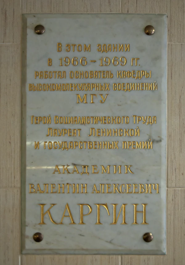 - Мемориальные доски в память В. А. Каргина установлены на здании НИФХИ им. Л. Я. Карпова, в помещениях лабораторного корпуса «А» Московского университета, где размещается кафедра высокомолекулярных соединений химического факультета МГУ, а также Института нефтехимического синтеза имени А. В. Топчиева Российской академии наук.