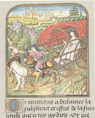Обычная средневековая карета представляла собой четырёхколесный крытый экипаж с полукруглым навесным козырьком над сиденьем кучера. Для известной с Бронзового века традиции построения конструкции шасси и колес, характерна традиционная технология закрепления передней оси.
