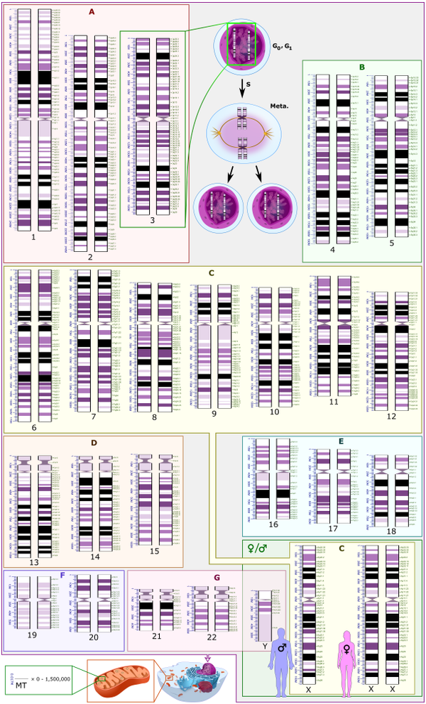 После фиксации препараты метафазных хромосом окрашивают и фотографируют; из микрофотографий формируют так называемый систематизированный кариотип — нумерованный набор пар гомологичных хромосом, изображения хромосом при этом ориентируются вертикально короткими плечами вверх, их нумерация производится в порядке убывания размеров, пара половых хромосом помещается в конец набора (см. Рис. 1).