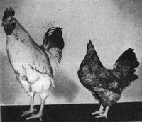 Двойная доза гена карликовости делает проявление признака гораздо более выраженным у самцов, чем у самок. На фотографии выше показан сравнительный размер двух петухов-полнородных братьев, родившихся в один день: слева — нормальный брат с генотипом Dw/dw, справа — карликовый брат с генотипом dw/dw.