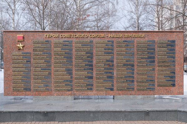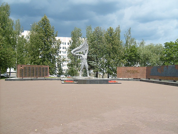 По левую руку воина — изогнутая бетонная стела с рельефным фризом из красной меди, на которой расположены изображения матери, обнимающей сына, сталевара и воинов в бою. Под ними надпись: «За подвиг ради жизни на земле отчизна-мать вам благодарна вечно». Загнутый по северному краю площади конец стелы содержит надпись: «Сынам и дочерям Удмуртии, внёсшим значительный вклад в победу в Великой Отечественной войне 1941—1945 годов». Помимо смысловой нагрузки функцией стелы является отделение монумента от жилых зданий. Экспрессивный, волнующий своей трагедийностью образ защитника Родины, задуманный автором, однако, не до конца соответствует законам масштабности и подлинной монументальности [9].