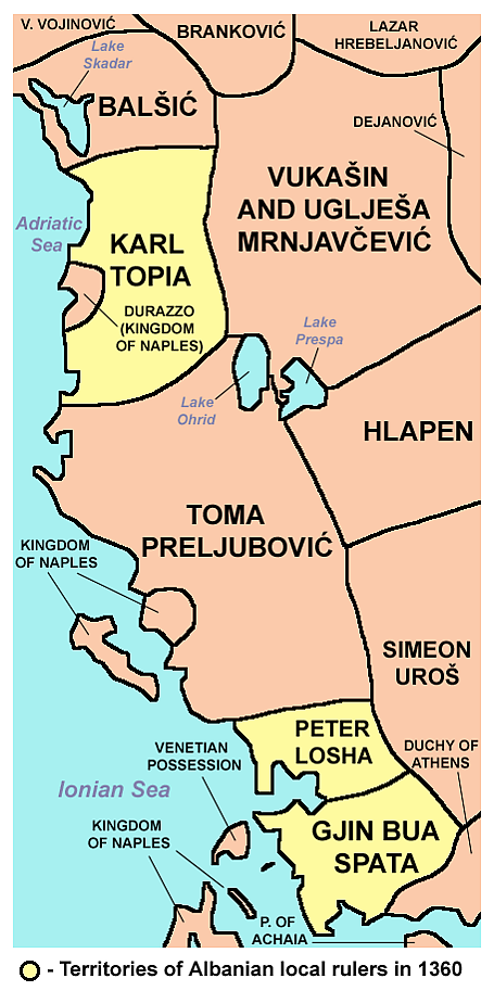 Будучи по матери внуком короля Роберто Неаполитанского, Карл Топия в 1358 году предъявил апанажные права на албанские территории, формально входившие в состав анжуйского Королевства Албания с центром в г. Дуррес, который ему удалось захватить только в 1368 году при поддержке венецианцев.