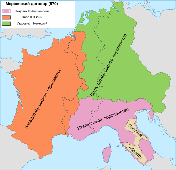 8 августа 869 года умер король Лотарингии Лотарь II, и Карл Лысый поспешил захватить Лотарингию. 9 сентября 869 года в Меце в соборе Сент-Этьен он короновался королём Лотарингии. Однако в январе 870 года он получил грозное требование брата Людовика Немецкого поделить с ним захваченное. В марте Карл Лысый согласился уступить брату половину Лотарингии. 8 августа 870 года братья встретились близ Мерсена на берегу Мааса и окончательно уговорились о границе раздела. И, если Карл должен был отказаться от Меца и Ахена, то он получил Льеж, Вьенн и весь правый берег Роны.