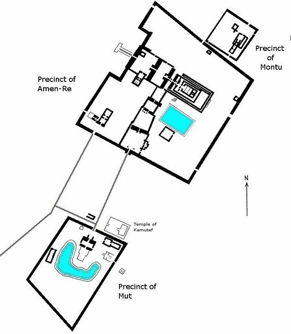 Наиболее значительным зданием всего комплекса является храм Амона-Ра с его 10 пилонами, крупнейший из которых имеет длину 113 метров, ширину 15 метров и высоту ок. 45 метров. Общая площадь храма составляет ок. 30 гектаров (четырёхугольник со сторонами в 530, 515, 530 и 610 метров). Помимо пилонов величественный вид представляет колонный зал, начатый при фараоне Хоремхебе и законченный в годы правления фараонов Сети I и Рамсеса II. Храмовые помещения состоят из трёх, окружённых стенами, частей: посвящённой Амону (Ипет-сут), посвящённой богу Монту (площадью в 2,34 га) и посвящённой богине Мут (площадью в 9,2 га).