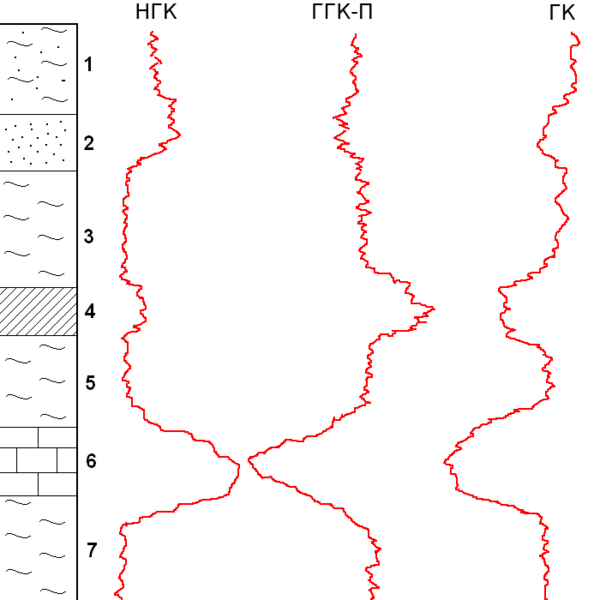 - НГК — нейтронный гамма-каротаж. Породу облучают источником нейтронов, в результате порода становится радиоактивной и в ответ регистрируют излучаемые ею гамма-кванты.