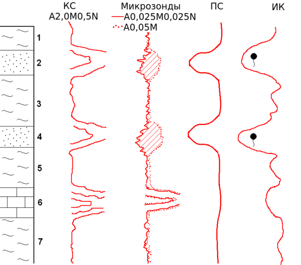 - собственно КС — кажущееся сопротивление с нефокусированными зондами. Самый распространённый метод данной группы, являющийся скважинным аналогом метода электрического профилирования в электроразведке