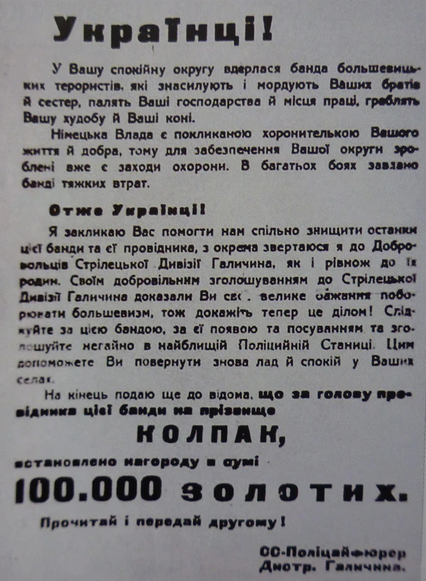 Появление Ковпака в Галиции вызвало беспокойство не только у оккупантов, но и у украинских националистов из Украинской повстанческой армии (УПА). Приход почти двух тысяч коммунистических партизан краевой провод ОУН (б) на западноукраинских землях расценил как угрозу для своего влияния на галичан. Архивные документы ОУН (б) отмечают: «В Галичине Украинская повстанческая армия не действовала, поскольку не было угрозы со стороны советских партизан, хотя Организация имела глубокие корни и шире вела организационную работу»[95]. Было понятно — ковпаковцы будут пытаться заложить базу для развертывания партизанского движения в Карпатах. Националистическое подполье не могло допустить, чтобы советские партизаны овладели и контролировали карпатский регион, естественный ландшафт которого создавал подходящие условия для проведения рейдов и хорошо защищал от немецких карательных акций. 15 июля 1943 г. Главный Провод ОУН (б) издал приказ о формировании т. н. Украинской народной самообороны (УНС) — галицкого аналога УПА на Волыни[96].