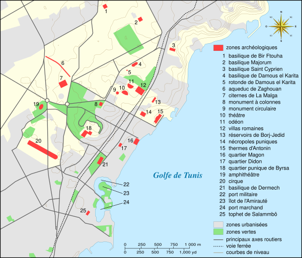 Высота суши на мысе на берегу моря к северо-востоку (ныне называемом Сиди-Бу-Саид) была вдвое выше над уровнем моря, чем у Бирсы (100 м и 50 м). В промежутках между хребтом, несколько раз достигающим 50 м; она продолжается и с северо-запада вдоль моря, и образует край плато, как зона между Бирсой и морем[103]. Новые разработки градостроительства находились здесь, в этих северных округах[104].