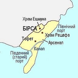 Наши знания о Бирсе, районе цитадели к северу, весьма отрывочны[85]. Склоны этого холма и крепости на нём были ареной ожесточённых боёв во время великой осады города в 146 году до нашей эры. Бирса, как сообщалось, была местом расположения храма Эшмуна (Бога исцеления), на вершине лестницы из шестидесяти ступеней[86][87]. Храм Танит (царицы-богини города), вероятно, был расположен на склоне „малой Бирсы“ непосредственно к востоку, в сторону к морю[88].