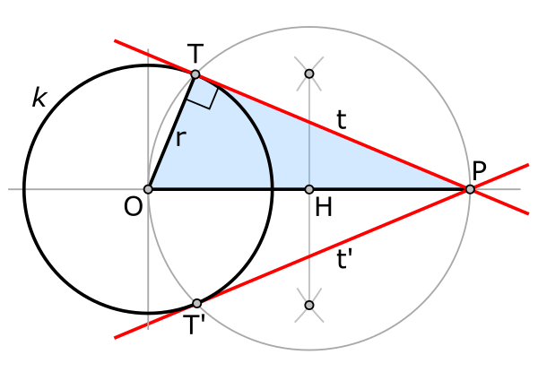 Для построения касательной прямой через точку P к окружности C можно использовать свойство угла, опирающегося на диаметр окружности. Проводится окружность с центром в точке H, середине отрезка OP, где O — центр окружности C. Пересечения T и T‘ являются точками касания прямых, проходящих через точку P, поскольку углы ∠OTP и ∠OT‘P опираются на диаметр OP окружности с центром в H.