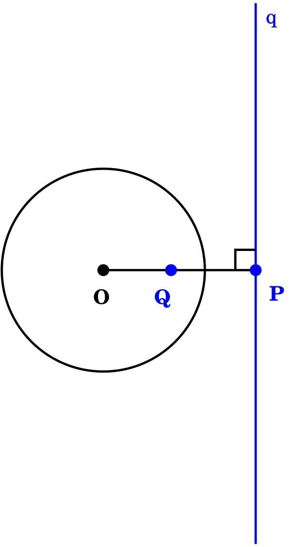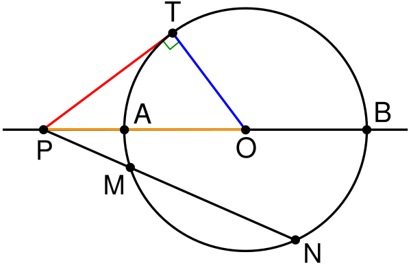 Никакая касательная прямая не может проходить через точку внутри окружности, поскольку любая такая прямая должна быть секущей. В то же время для любой точки, лежащей вне круга, можно построить две проходящие через неё касательные прямые. Геометрическая фигура, состоящая из окружности и двух касательных прямых, также обладает осевой симметрией относительно прямой, соединяющей точку P с центром окружности O (см. рисунок справа). В этом случае отрезки от точки P до двух точек касания имеют одинаковую длину. По теореме о степени точки квадрат длины отрезка до точки касания равен степени точки P относительно окружности C. Эта степень равна произведению расстояний от точки P до двух точек пересечения окружности любой секущей линией, проходящей через P.