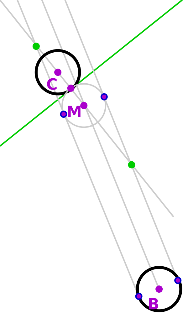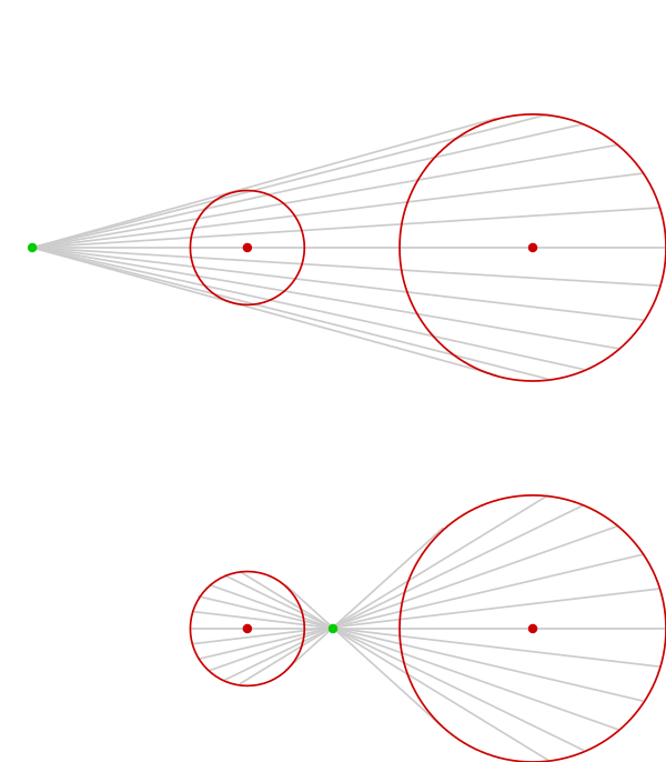 Геометрически это соответствует вычислению угла, образованного касательной и прямой, проведённой через центры, а затем линия центов поворачивается для получения уравнения касательной. Угол можно вычислить с помощью тригонометрии из прямоугольного треугольника, вершинами которого являются (внешний) центр гомотетии, центр окружности и точка касания. Гипотенуза лежит на прямой центров, радиус является катетом, противоположным углу, а прилегающий к углу катет лежит на касательной прямой.