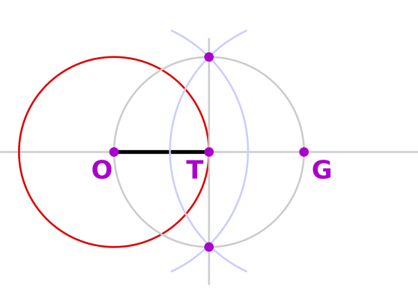 Относительно легко построить прямую t, касательную к окружности в точке T на окружности. Для этого следует провести прямую a через центр окружности O и точку T. Тогда прямая t является перпендикуляром к прямой a. Один из способов построения перпендикуляра следующий (см. рисунок). Проводим тем же радиусом (r) окружность с центром в точке T, получаем вторую точку G на прямой a, а точка T становится серединой отрезка OG. Проводим две окружности радиуса R>r с центрами в точках O и G. Прямая, проходящая через точки пересечения этих окружностей, будет касательной.