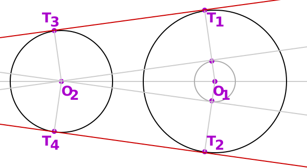 В общем случае точки касания t1 и t2 для любой из четырёх касательных прямых к окружностям с центрами в v1 и v2 и с радиусами r1 и r2 получаются путём решения четырёх уравнений: