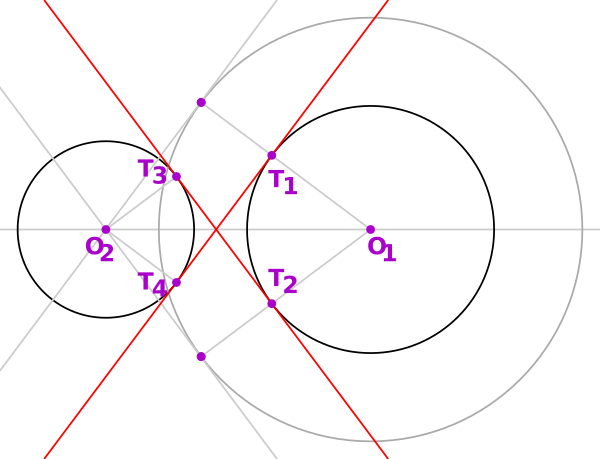 Пусть O1 и O2 — два центра двух окружностей C1 и C2 и пусть r1 и r2 — их радиусы, при этом r1 > r2. Другими словами, окружность C1 будем считать большей из двух окружностей. Два различных способа можно использовать для построения внешних и внутренних касательных прямых.