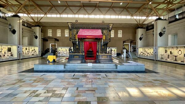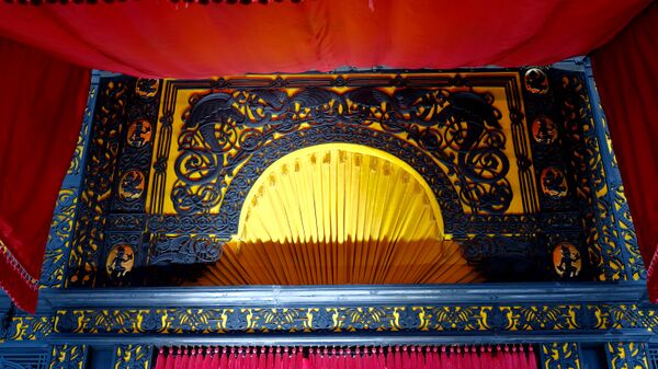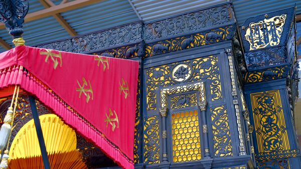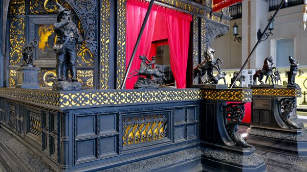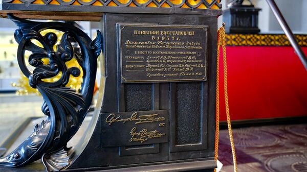 В 2010 году златошвеи Ново-Тихвинского женского монастыря воссоздали исторический облик бархатного балдахина, венчающего центральный вход павильона. Бархат был расшит изображениями торговой марки Кыштымского горного округа[10][58].