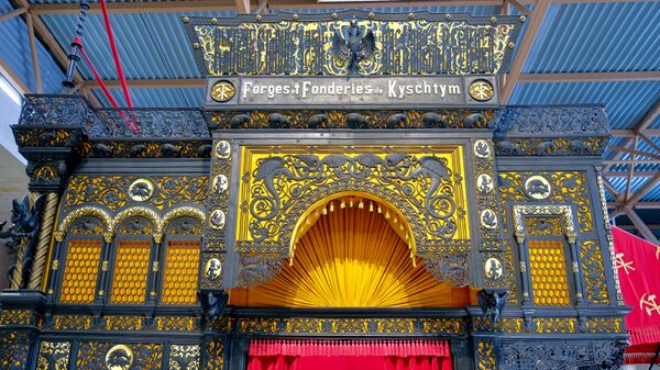 Павильон представляет собой прямоугольное сооружение высотой около 5 метров с ажурными орнаментами на стенах и элементах каркаса. Внутрь ведут три входа: два по центральной оси, оформленные сверху ажурной короной с надписью «Кыштымские горные заводы наследников Расторгуева», и третий вход, расположенный перпендикулярно им и украшенный красным бархатным балдахином на чугунных пиках[59]. Детали окрашены в чёрный цвет и позолочены. Чёрная окраска чугуна контрастирует с красным бархатом. В советское время золочение отсутствовало, его заменял слой бронзовой краски. В 2000 году реставрационные работы по золочению павильона были завершены, и была заново полностью воссоздана идея, предложенная Е. Е. Баумгартеном более века назад[10].