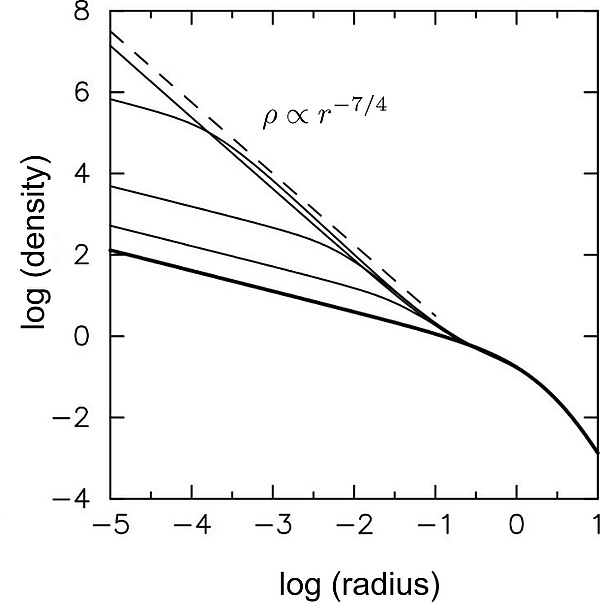 что соответствует плотности ρ=ρ0 r −7/4. На рисунке показано, как меняется плотность звёзд. Полностью сформированный касп[4] простирается до расстояния около одной пятой радиуса влияния сверхмассивной чёрной дыры. Считается, что время релаксации в ядре маленьких плотных галактик достаточно мало для того, чтобы мог сформироваться касп Бакалла — Вольфа.[5]